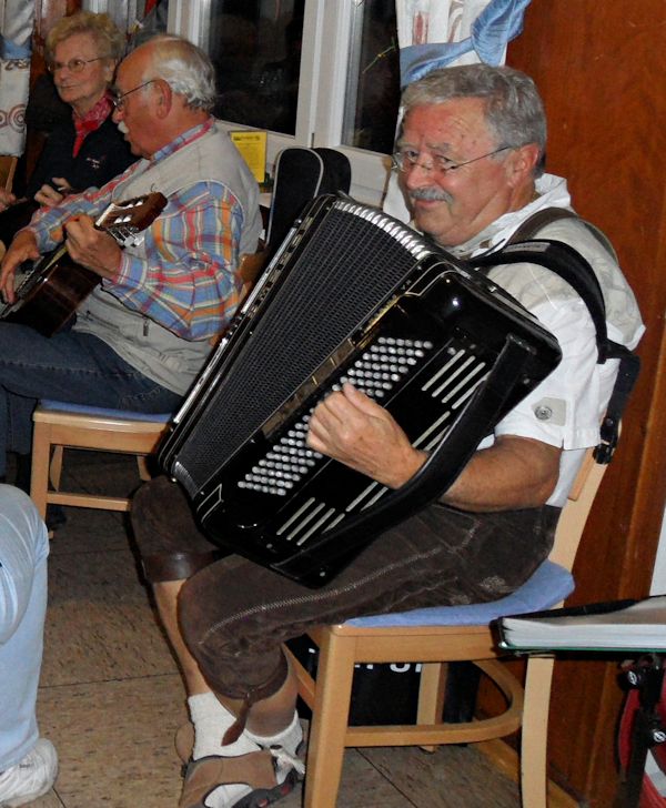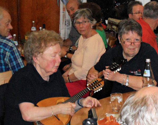 die Instrumentalisten Klaus Müller (Akkordeon) und die Zupfmusikgruppe unserer Ortsgruppe. Berg- und Wanderlieder, aber auch bekannte Unterhaltungslieder, wurden aus voller Kehle und mit Begeisterungmitgesungen. Passend dazu las Paul Mehrer aus der „Wanderbibel" über die Eigenarten einer Berghüttenübernachtung.